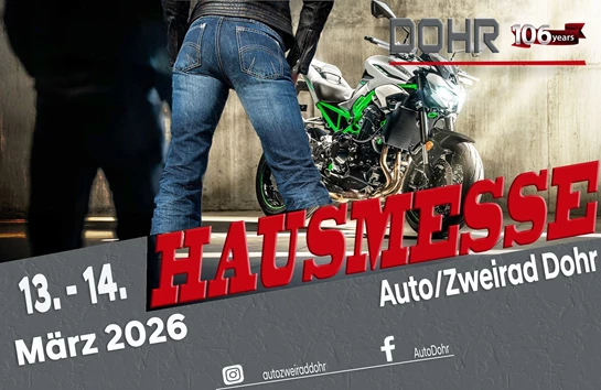 Am 13. und 14. März 2026 laden wir euch zur großen Hausmesse bei Zweirad Dohr ein. Zwei Tage von 9 - 18 Uhr, voller Motorradleidenschaft, neuer Modelle und echter Benzingespräche.